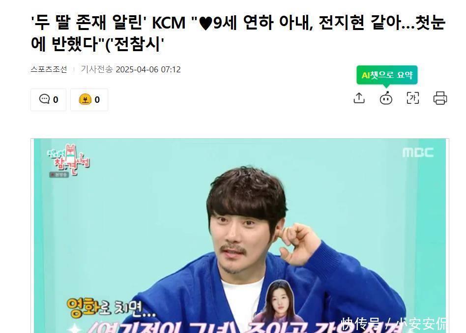 大家好呀,这里是你们的小娱~今天咱们来聊聊歌手KCM首次公开的家庭故事!据韩国媒体4月6日报道,歌手KCM透露了此前未能向外界公开两个女儿和小9岁妻子的原因,还表示小9岁的妻子像全智贤,和她一见钟情。